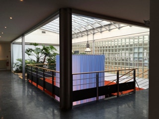 Un paysage en 3D est imprimé sur un tissu aussi synthétique que l’image. L’espace minimal se crée par la mise en forme de ce rideau sur une tringle elliptique.